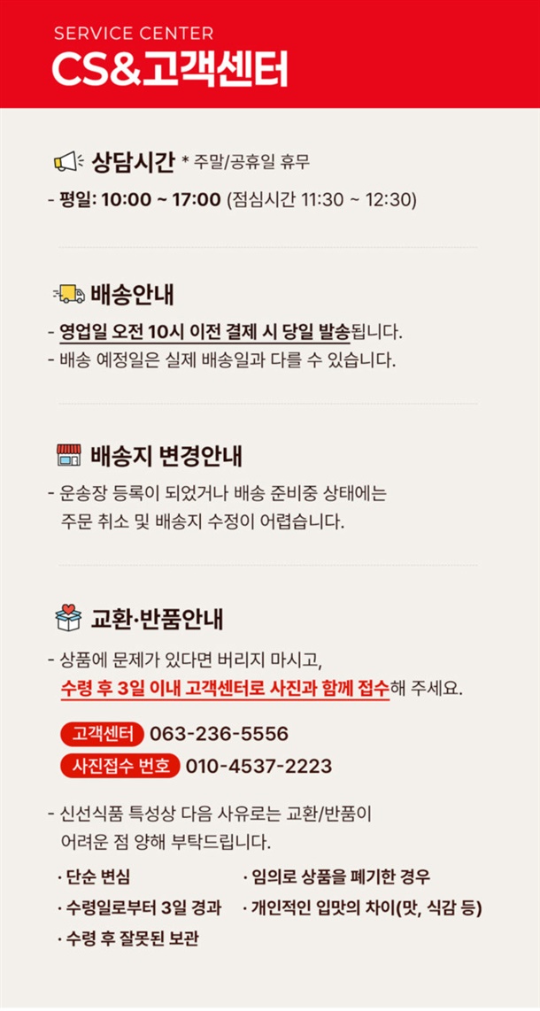 · 상품 불량 사유와 사진을 남겨 주시면 빠른 처리가 가능합니다.